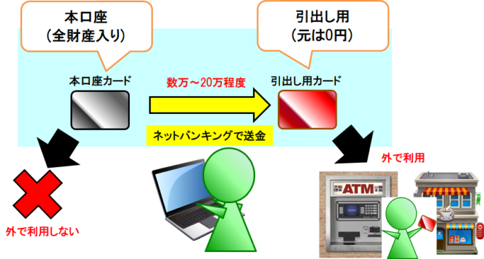 まず「本口座」の方にお金を全て入れておき、直近で利用する金額だけをネットバンキングで「引出し用口座」へ送金。実際にATMからの引出しやレストランなどでのクレジットカード利用では「引出し用口座」のカードしか利用しないと言う方法です。